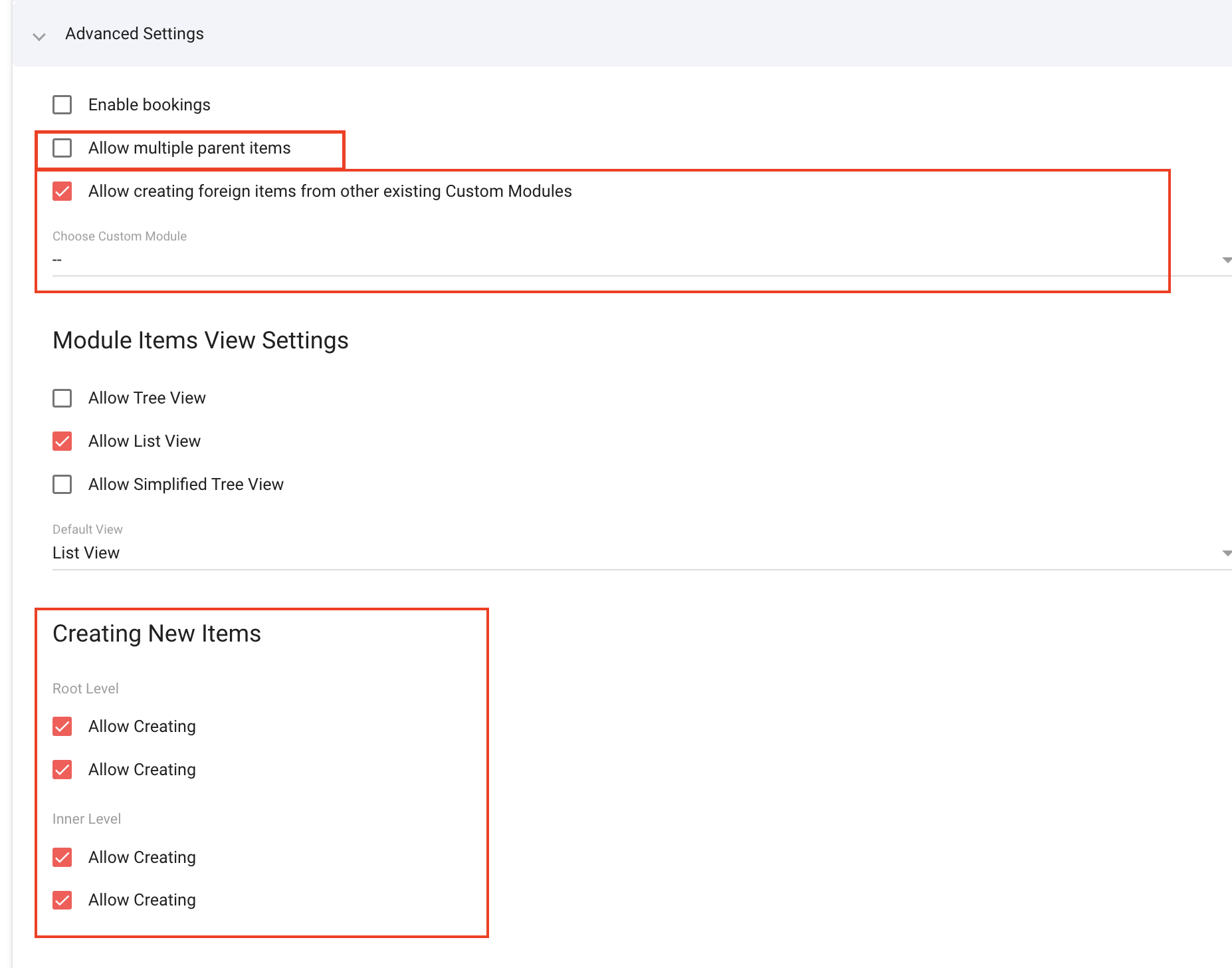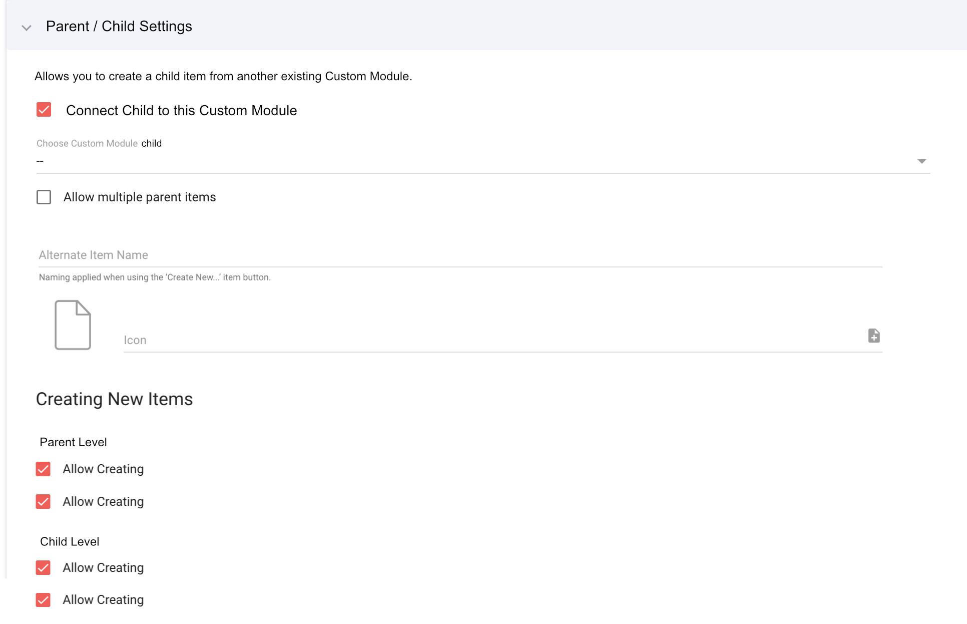 Add a new panel item called Parent / Child Settings or Nested Module Settings. The current “Allow creating foreign items from other existing Custom Modules” doesn’t make sense but could be reworded as the description. “Allows you to create a child item from another Custom Module.”