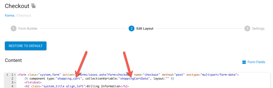 Also note, the shopping_cart component is by default setup in the checkout form code, so if you haven’t already moved this to the checkout system page you may need to do that too so that you can access the data on that page rather than just in the form layout.