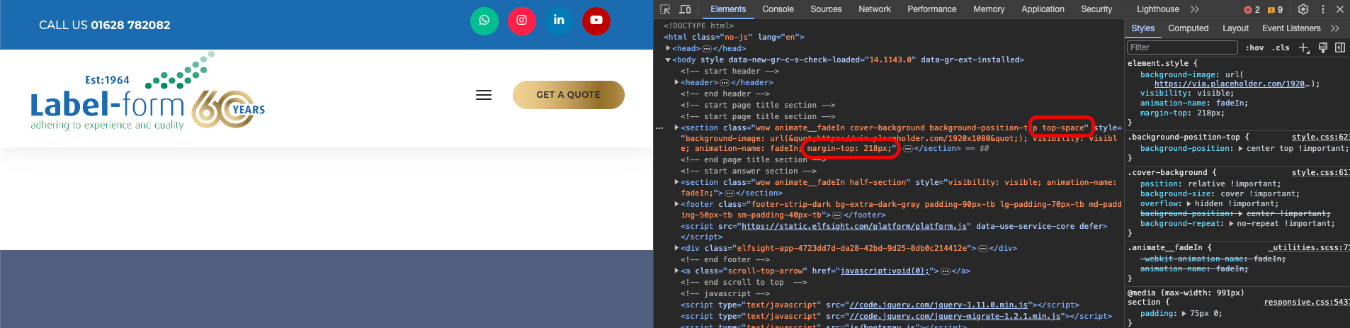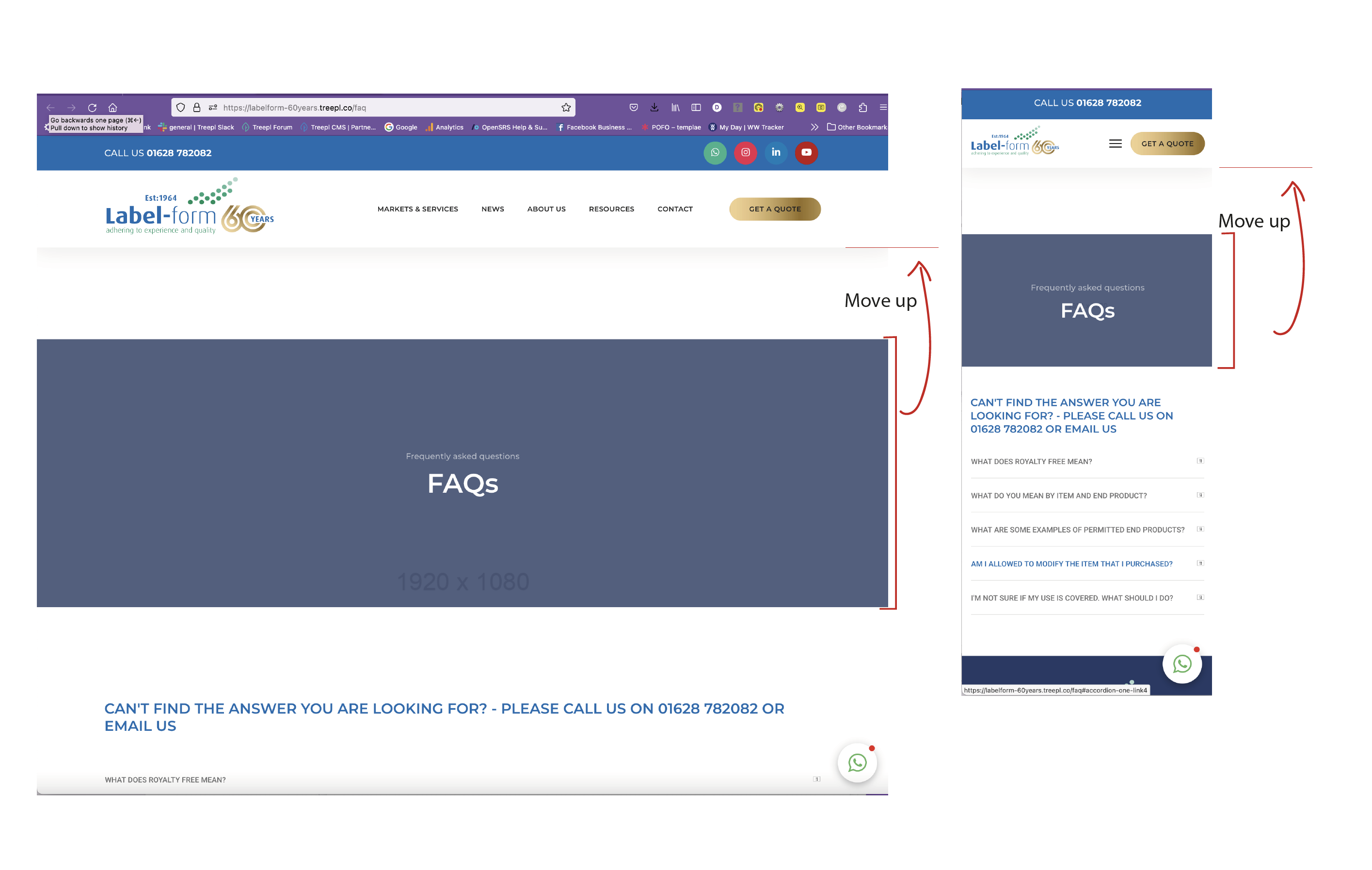 On this page (https://labelform-60years.treepl.co/faq) the blue header image with the title “Frequently asked questions FAQs’. The blue image header needs to be flush under the main menu bar, but